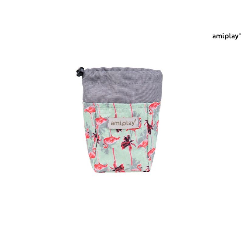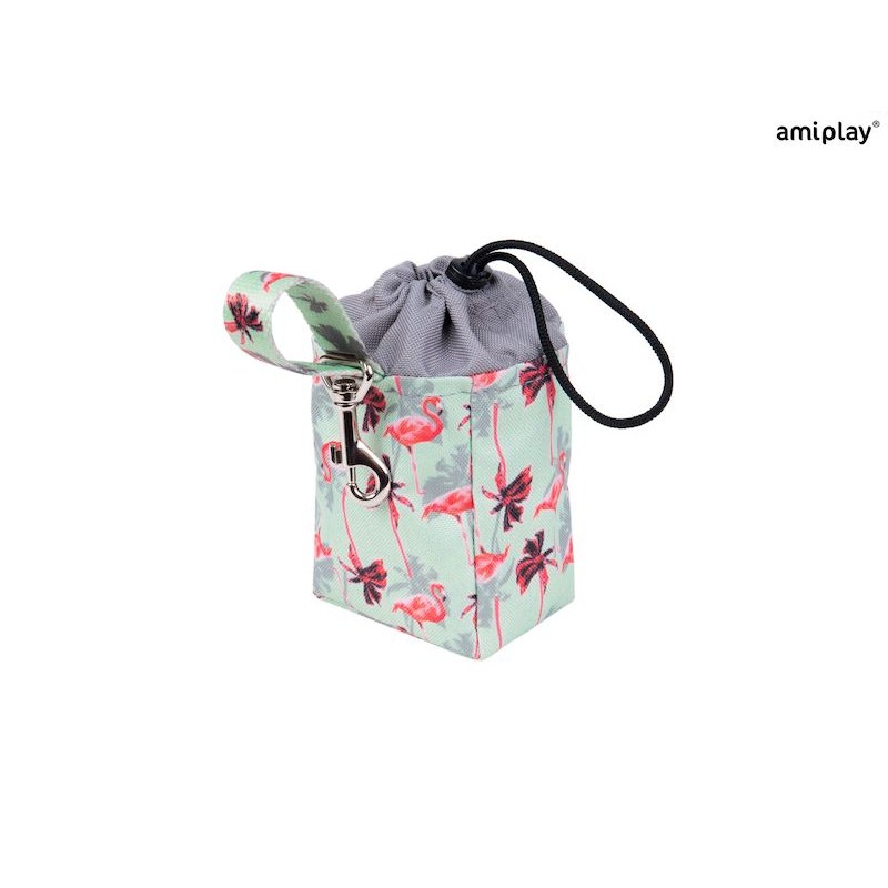 Torebka posiada szlufkę wraz z karabińczykiem, więc można przypiąć ją bezpośrednio do spodni bądź przewlec przez pasek. Aby uniknąć wysypywania się przysmaków albo chronić zawartość przed deszczem, wystarczy zamknąć saszetkę za pomocą ściągacza.