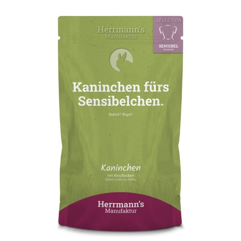 Karma dla psów z nietolerancjami z łatwo przyswajalnymi składnikami, takimi jak królik, marchew, płatki ryżowe, oczywiście z tylko jednym źródłem białka zwierzęcego. To karma odpowiednia dla psów wrażliwych na składniki odżywcze i starszych psów. Karmy HERRMANN'S Selection „dla dorosłych" i „sensitive (dla wrażliwych psów)" nadają się również jako podstawowe menu do karmienia psów od 2. miesiąca życia, pod warunkiem indywidualnego uzupełniania ich w szczególnych fazach życia w pierwszym roku życia (np. silny wzrost i wymiana zębów). Karma polecana także w diecie eliminacyjnej.