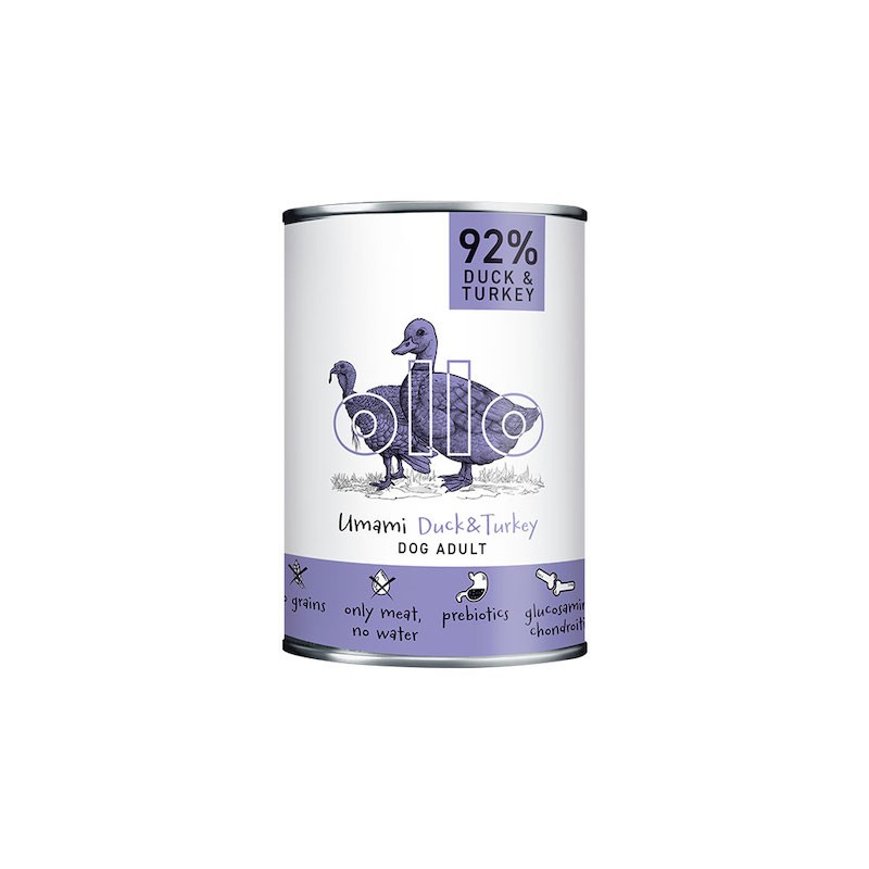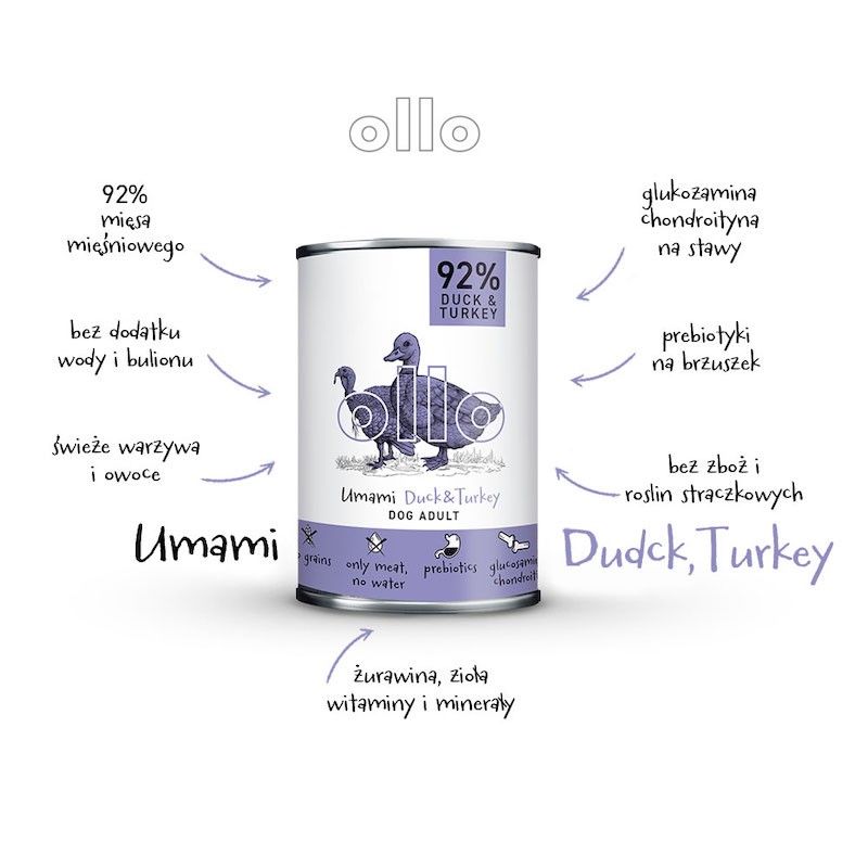 Karma mokra dla psa Ollo Duck&Turkey składa się z 72% mięsa mięśniowego z kaczki oraz 20% mięsa mięśniowego z indyka.