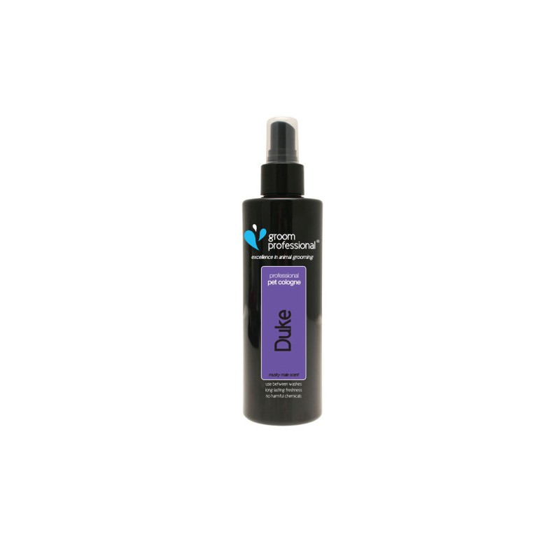Woda toaletowa dla psa Groom Professional Duke Cologne - o mocnym męskim zapachu wody kolońskiej. Zawiera w składzie kojący rumianek. Skutecznie perfumuje szatę nadając dodatkowo blasku. Bezpieczna dla skóry i sierści. Do częstego stosowania.