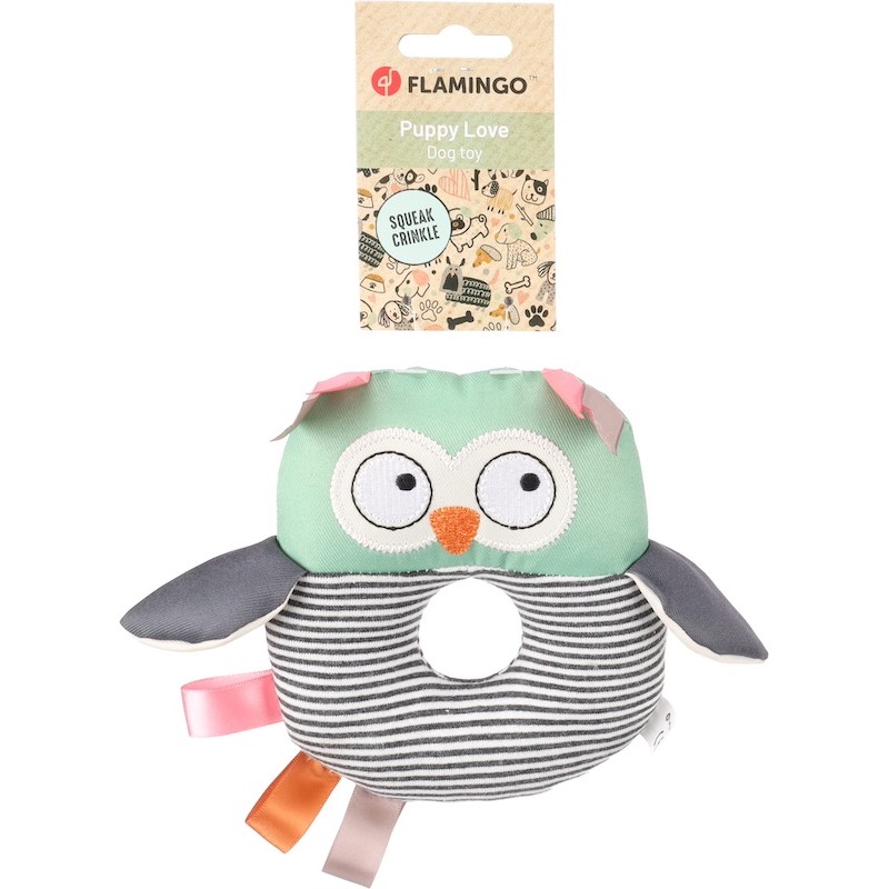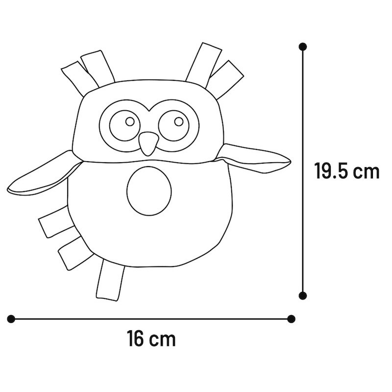 Zabawka wykonana z miękkiego materiału, z piszczącym i szeleszczącym dźwiękiem w środku. Pluszowa sowa zapewnia wiele chwil udanych harców.