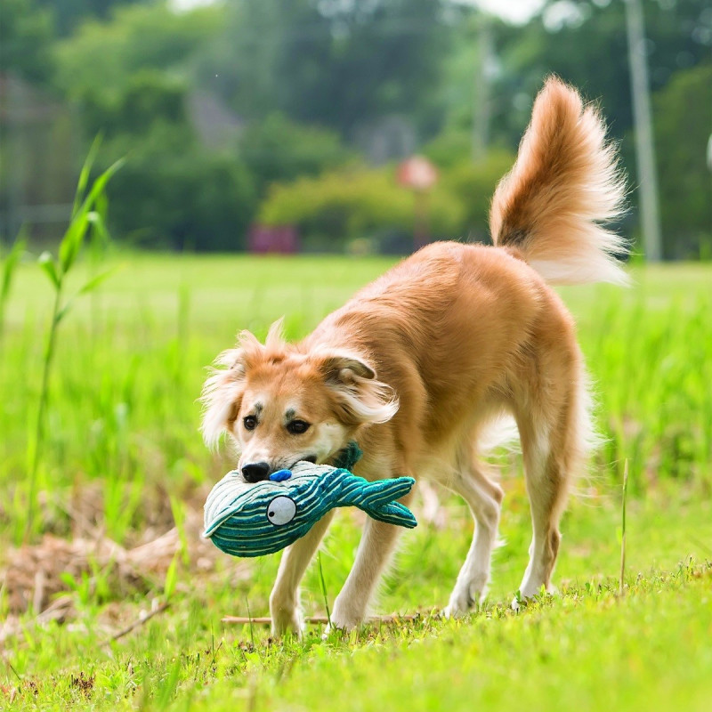 Pluszowa zabawka dla Psa w postaci sztruksowego wieloryba z wszytą piszczałką i szeleszczącą folią