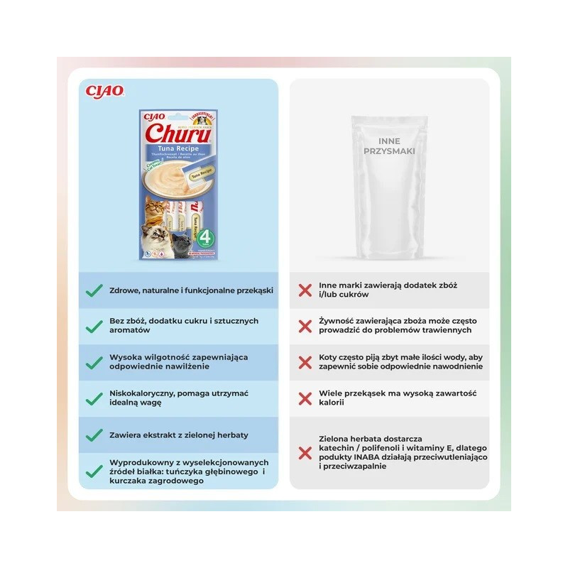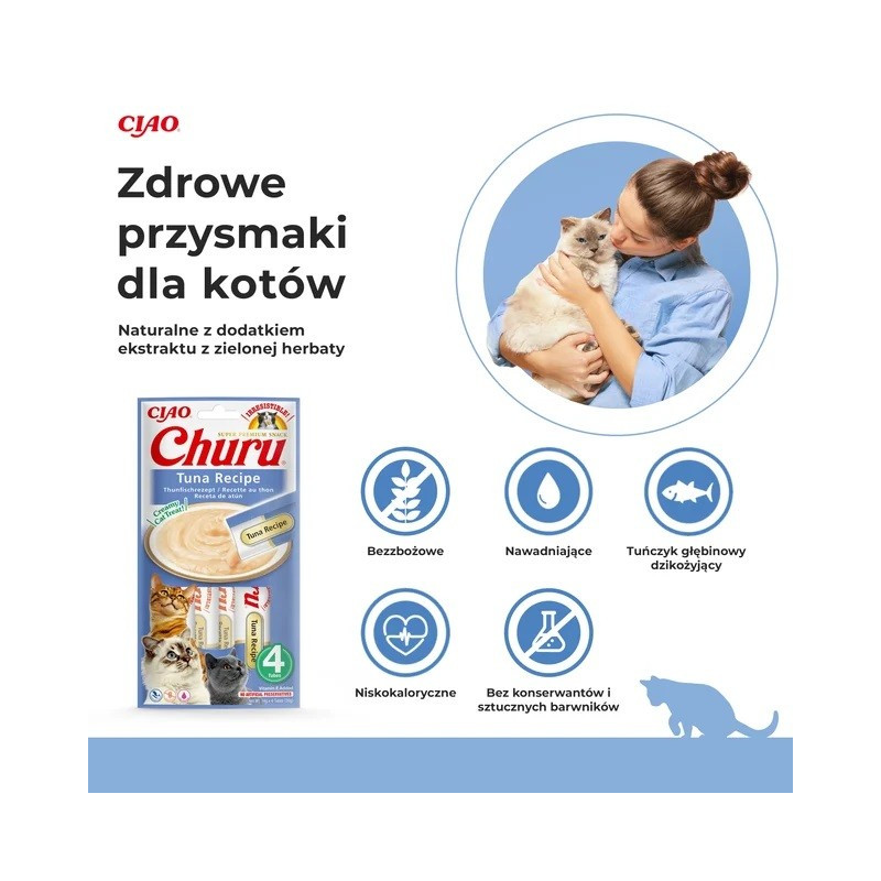 Churu® sprawia, że czas przekąski jest dla kotów świetną zabawą. To smaczne i zdrowe przysmaki w łatwych do otwarcia opakowaniach, które Twój kot po prostu pokocha lizać! Zaprojektowane do karmienia kota z ręki. Te niewiarygodnie smaczne sosiki o aksamitnej konsystencji produkowane są z najwyższej jakości składników „human grade”, czyli jakości jak dla ludzi. Churu są niskokaloryczne, nie zawierają zbóż i konserwantów, są produkowane z mięsa pochodzącego od kurczaków z wolnego wybiegu, naturalnie hodowanych na ściśle nadzorowanych fermach oraz z tuńczyka dalekomorskiego odławianego w sposób zrównoważony i certyfikowany i bezpieczny dla delfinów.