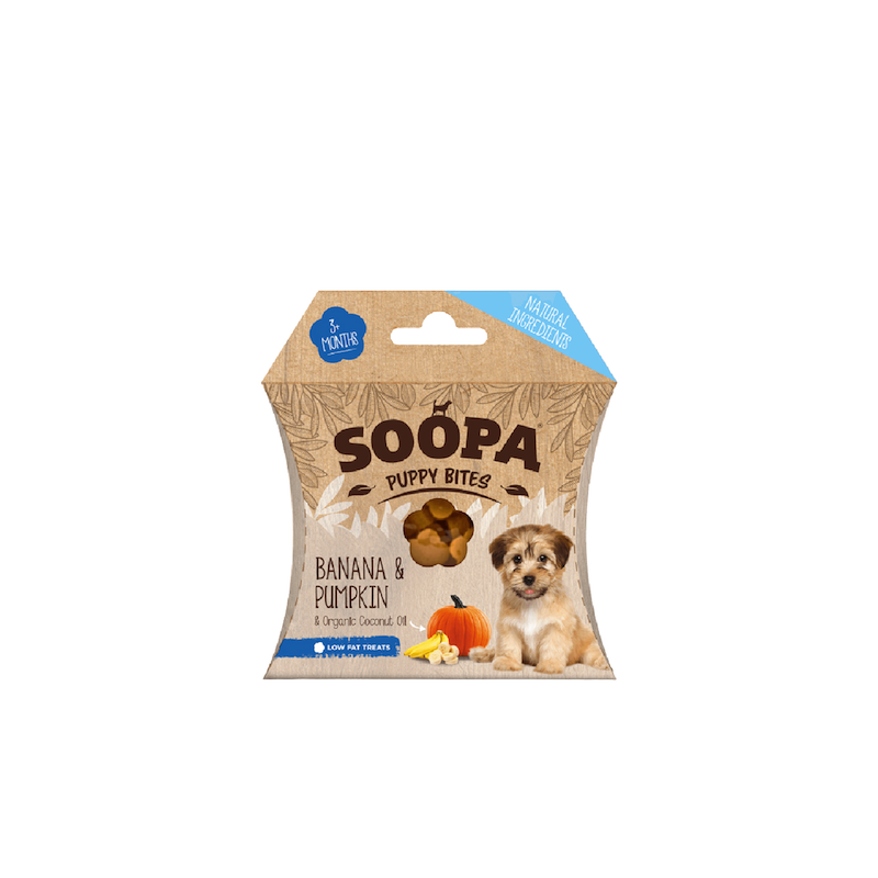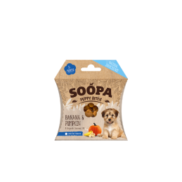 Soopa Healthy Bites są bezzbożowe, hipoalergiczne i wykonane z naturalnych składników najwyższej jakości (human grade). Te małe kawałki wielkości kęsa doskonale nadają się do treningu, pakowane są w mocną folię strunową i poręczne pudełko, dzięki czemu łatwo go używać również w podróży!