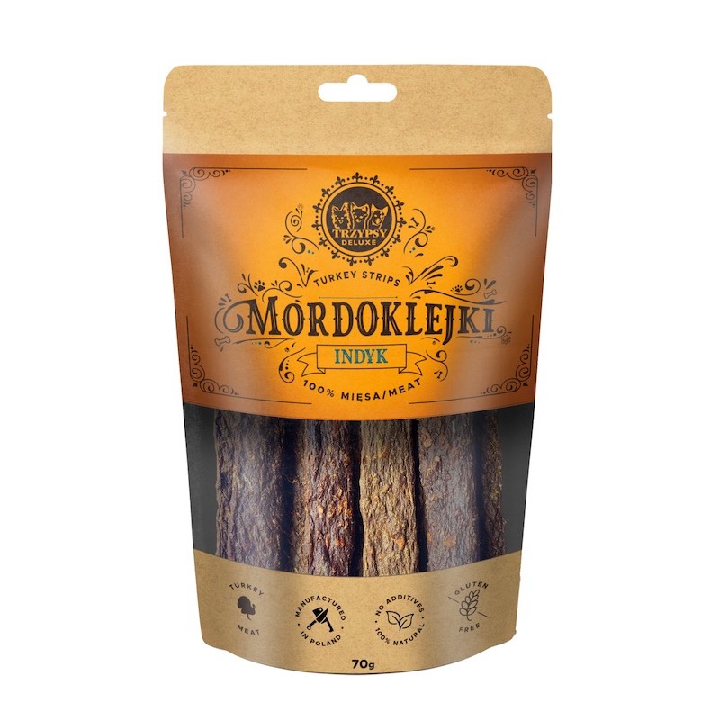 TRZYPSY Mordoklejki to w pełni naturalne gryzaki dla psów, wykonane ze 100% mięsa w formie podłużnych pasków. Nie zawierają konserwantów ani barwników. Przysmak ten jest smaczny i pożywny, stanowi doskonałe uzupełnienie codziennej diety naszego pupila. Idealnie sprawdzą się jako nagroda.