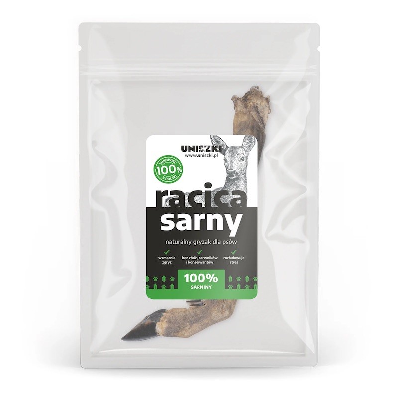 Każdy psiak ma naturalną potrzebę żucia i gryzienia. Dzięki racicy sarny może w szybki i przyjemny sposób ją zaspokoić. Ten twardy gryzak daje wiele radości zwierzęciu, ale też korzyści. Zawarte w nim witaminy i minerały wzmacniają stawy oraz kości. Racica sarny pomaga w usunięciu płytki bakteryjnej i kamienia z zębów. Wzmacnia wszystkie mięśnie żuchwy i zapewnia piękne oraz zdrowe uzębienie.